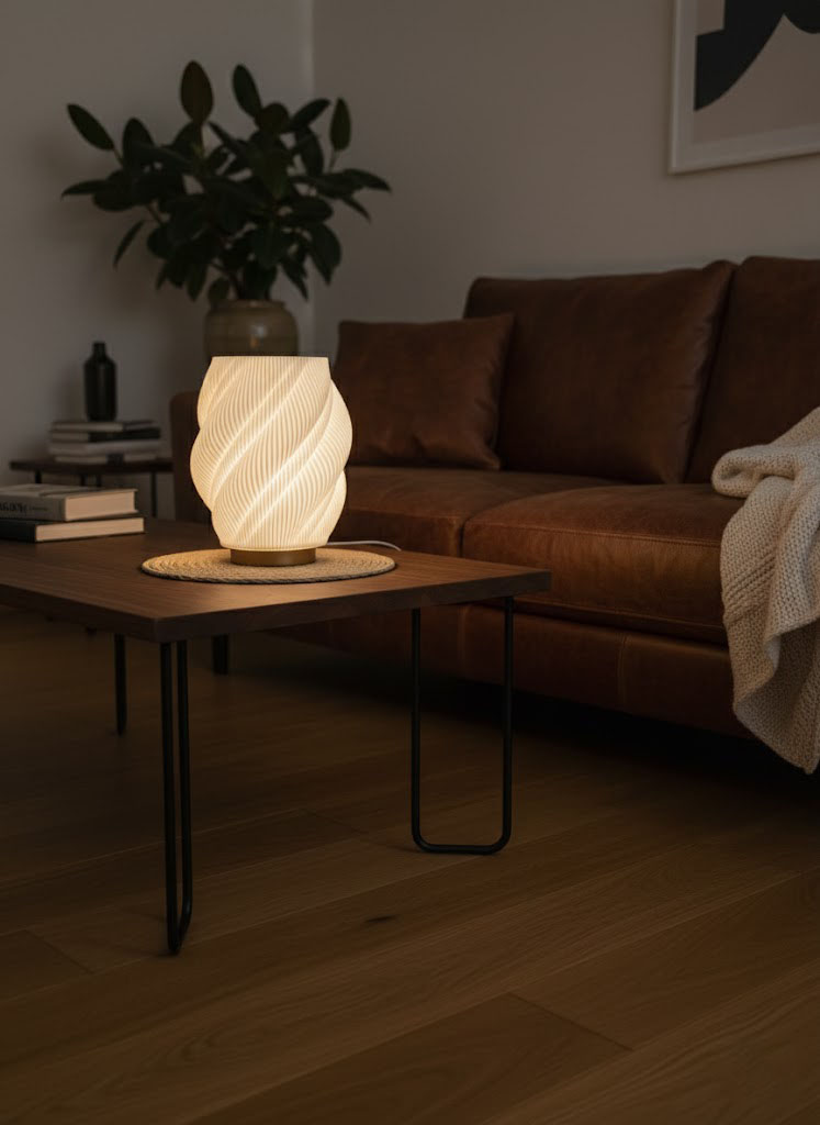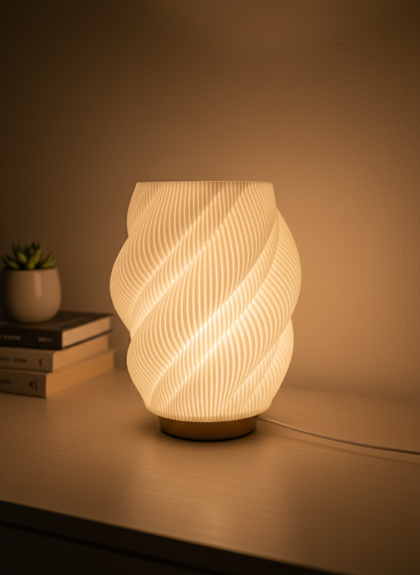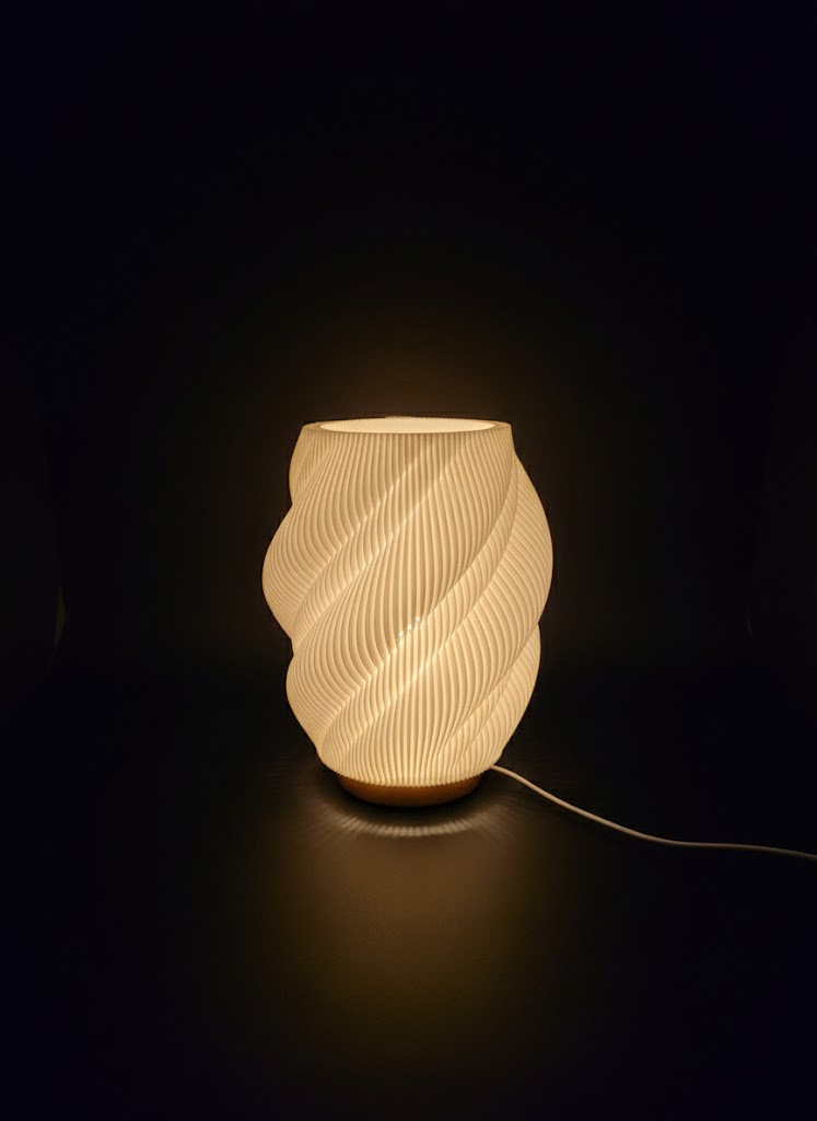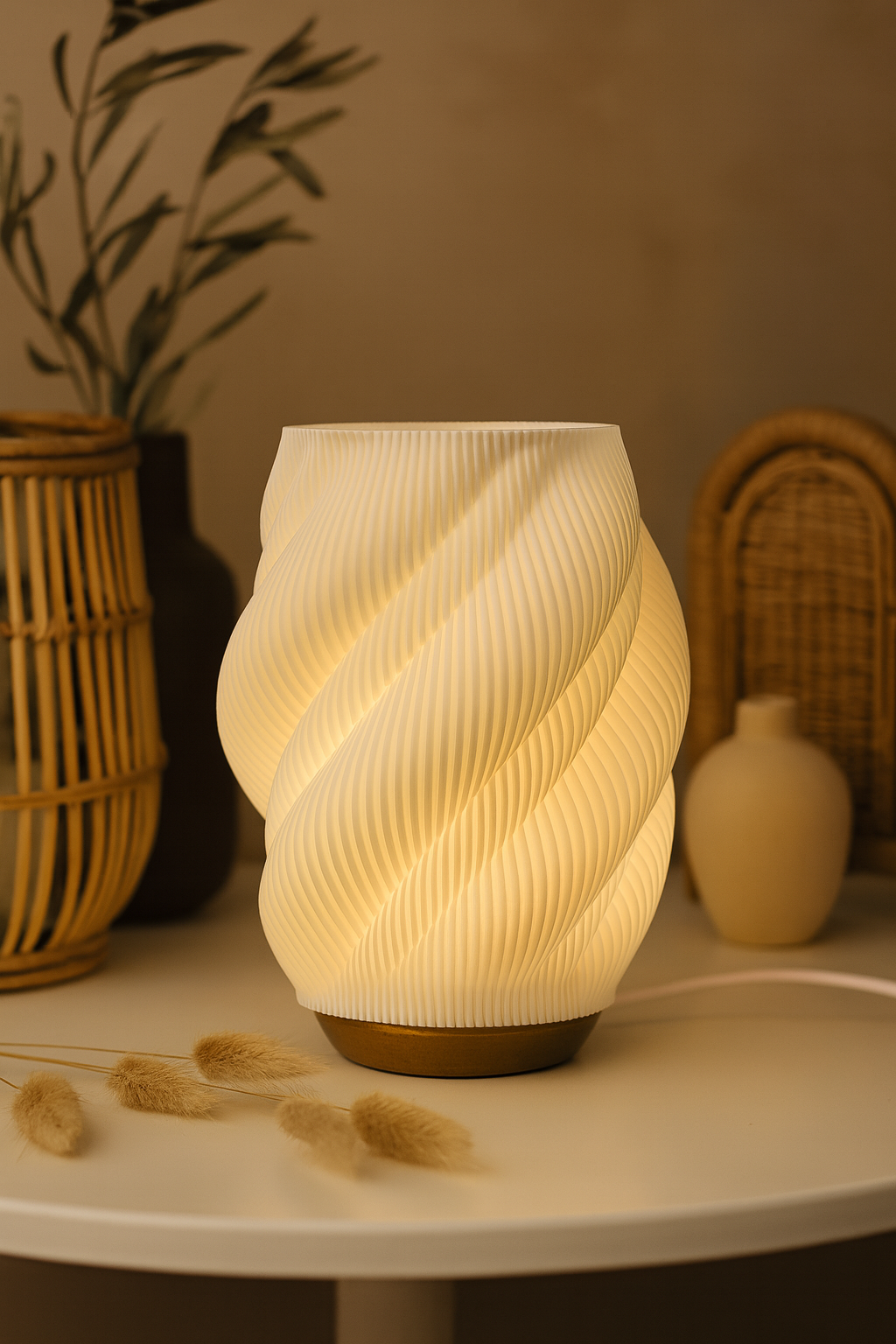 Lampa drukowana z ekologicznego PLA z podstawą z drewna litego.