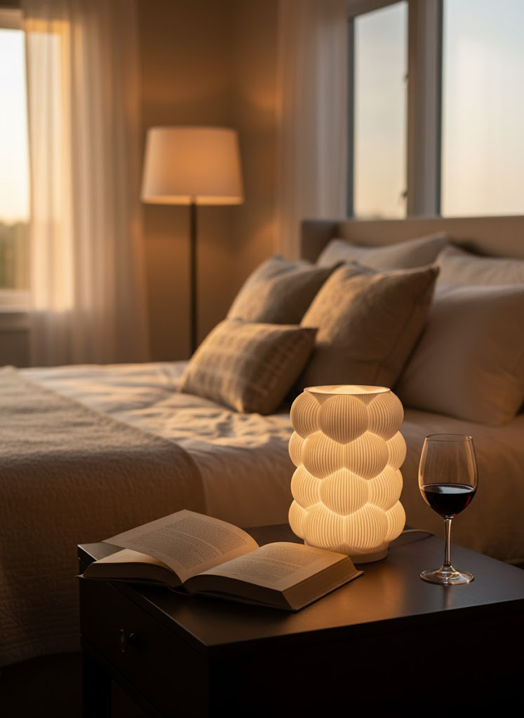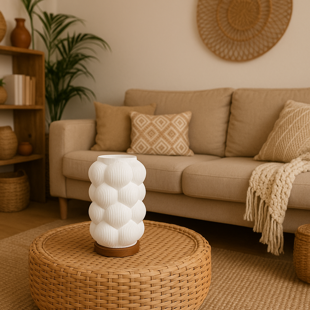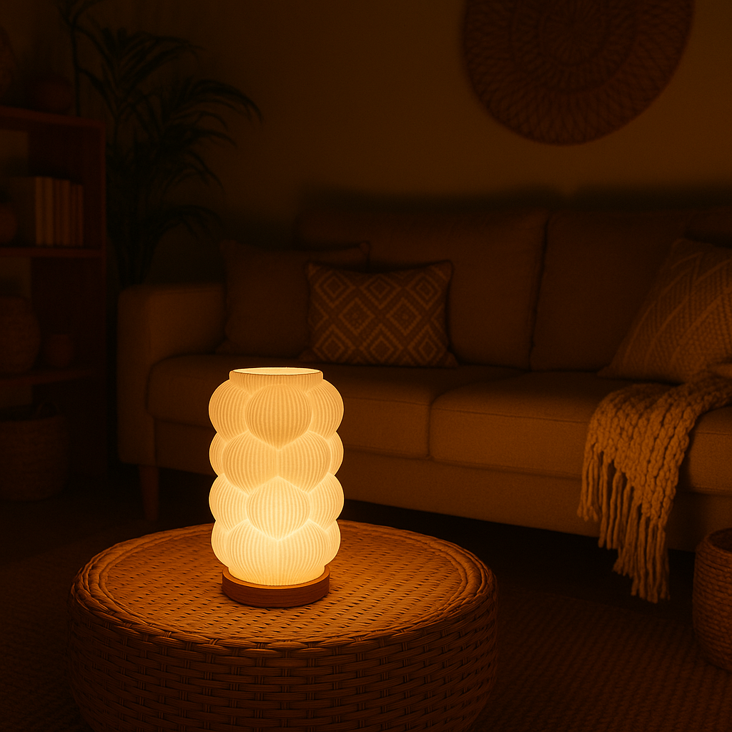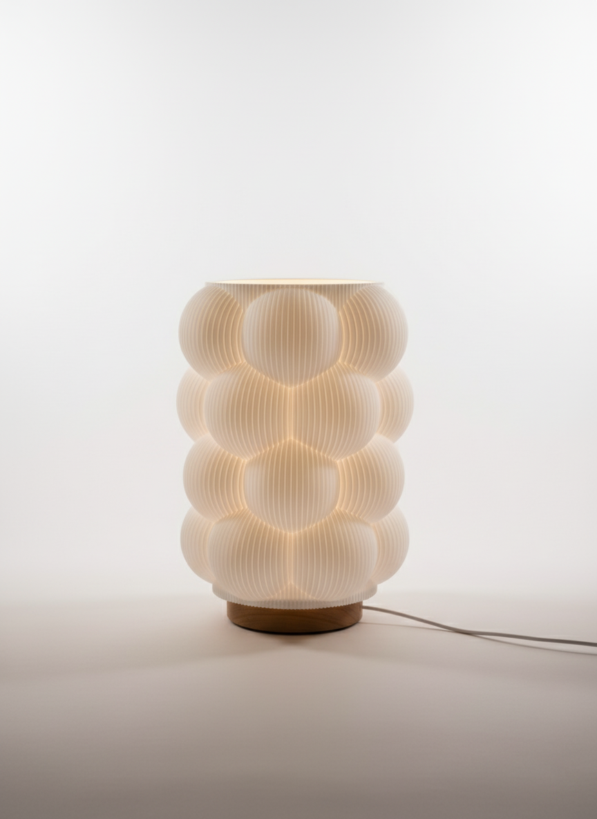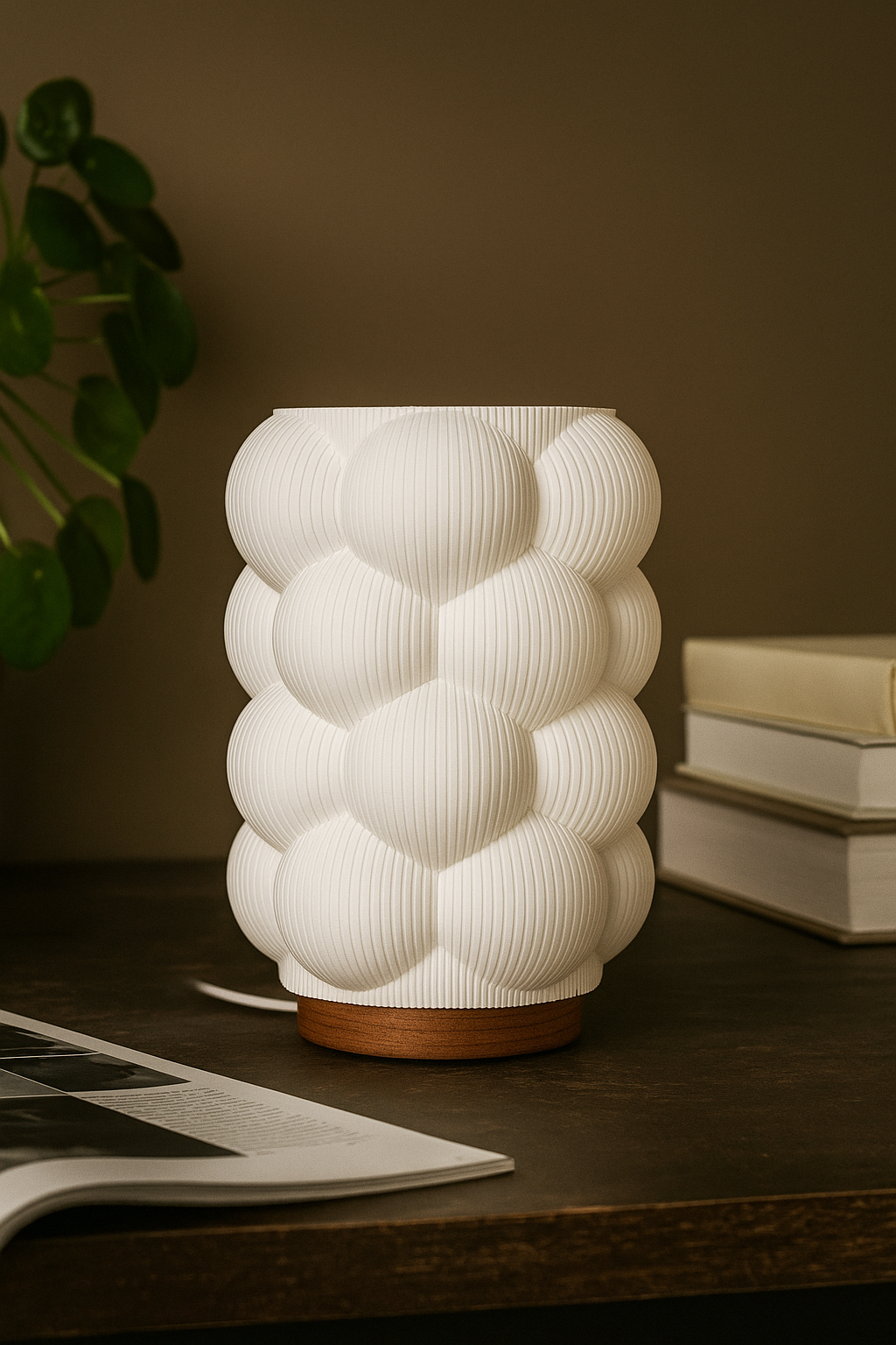 Lampa drukowana z ekologicznego PLA z podstawą z drewna litego.